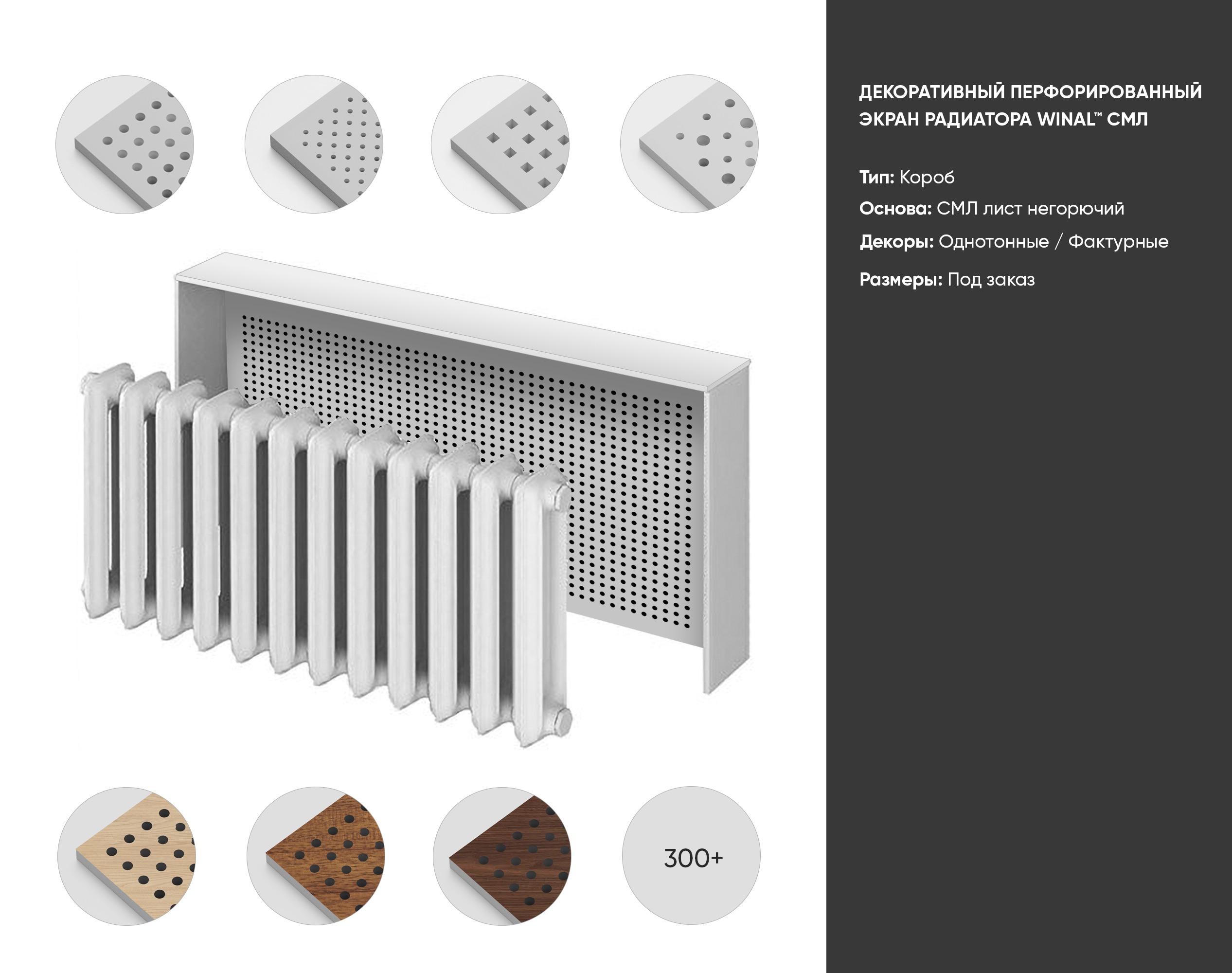 Новая коллекция перфорированных экранов для радиаторов на основе СМЛ листа – стиль, безопасность и эффективность в одном продукте. Новый уровень стиля и функциональности с перфорированными экранами для радиаторов WINAL™ СМЛ, выполненными из прочного негорючего магнезита (MgO). Эти декоративные панели разработаны с учетом потребностей современного интерьера, где важно не только скрыть отопительное оборудование, но и сделать его гармоничным элементом пространства.