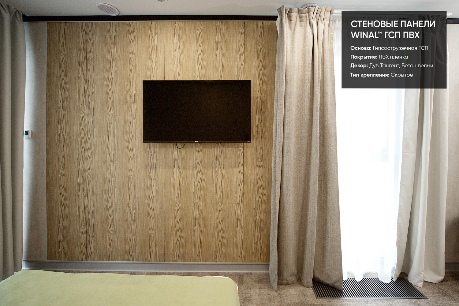 Стеновые панели на основе гипсостружечной плиты ГСП, ламинированные под дерево с текстурой Дуб тангент по каталогу ПВХ пленок. Обладают балансом плотности и прочности со способностью к изгибу, устойчивы к нагрузкам и механическим повреждениям. Решение отлично подходит для отделки стен спортивных объектов, офисов, торговых помещений, детских садов, школ и других общественных и коммерческих помещений.