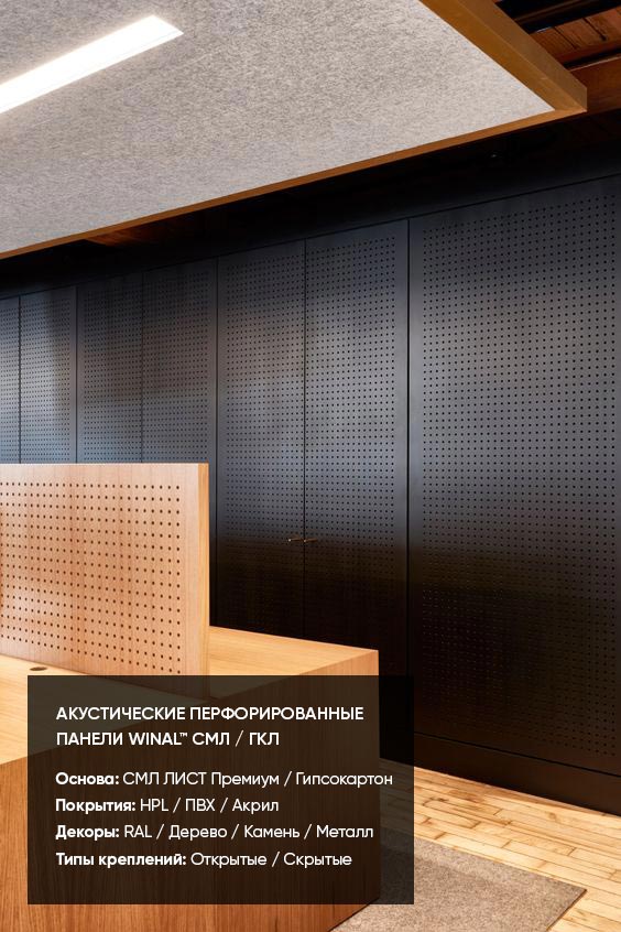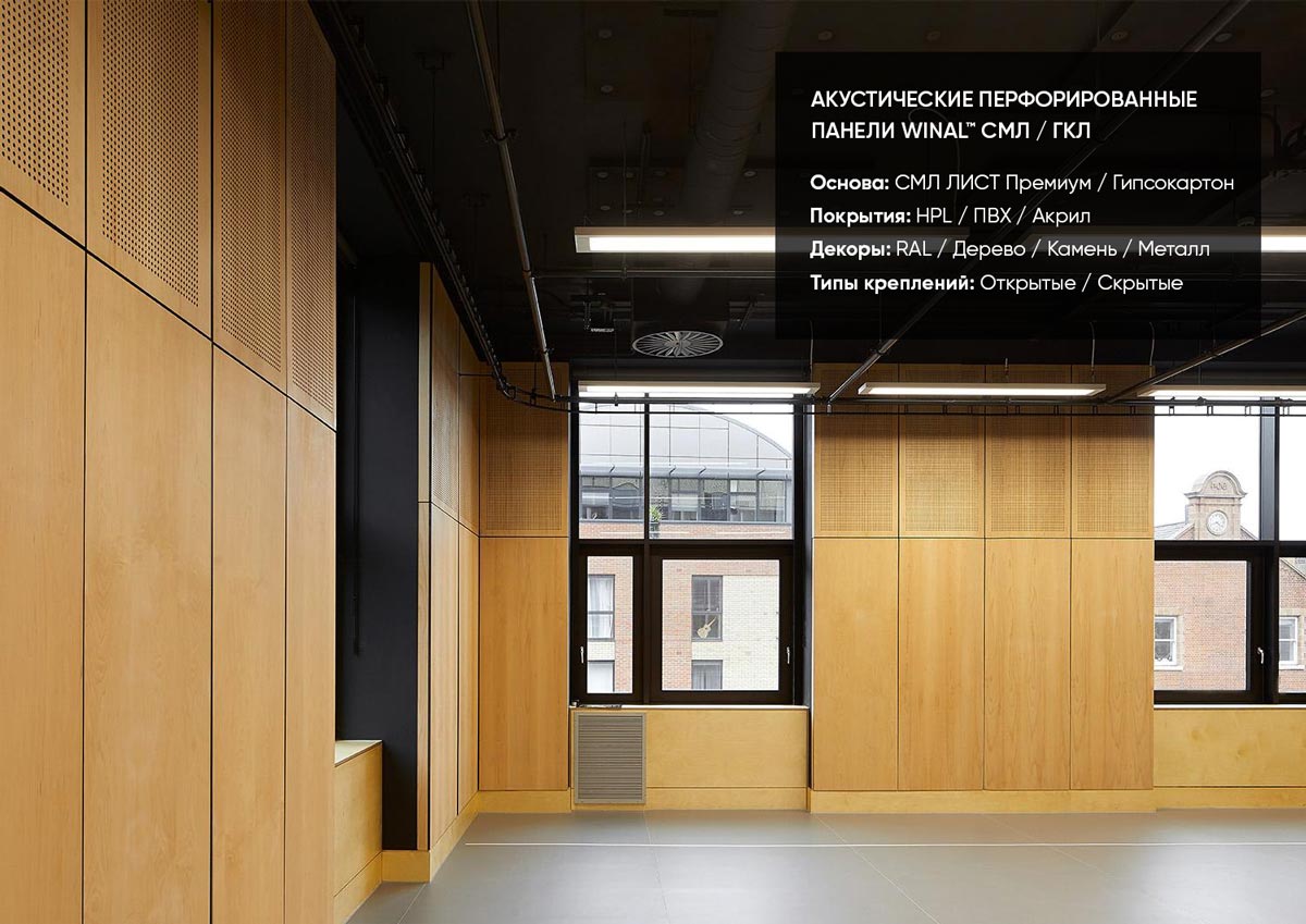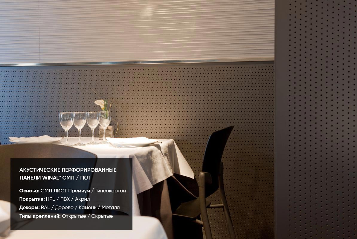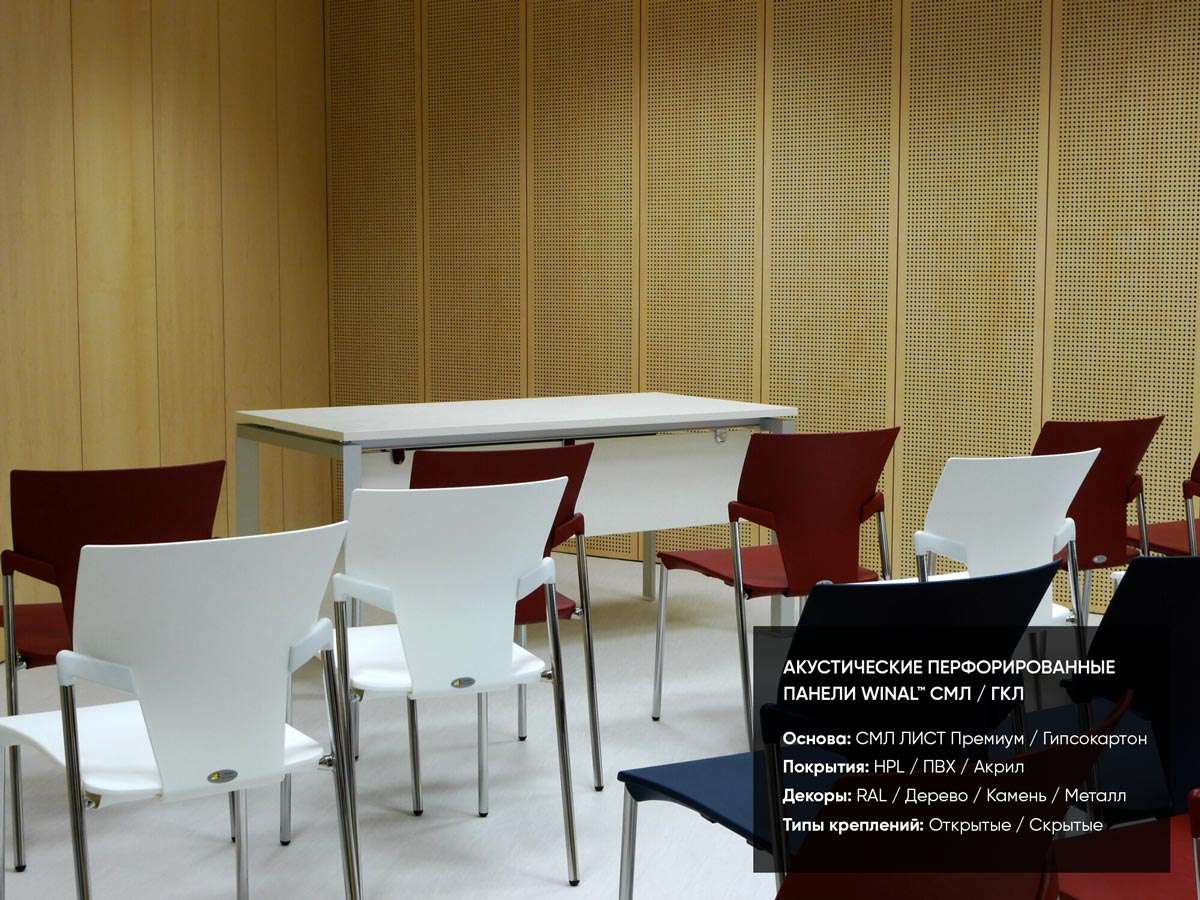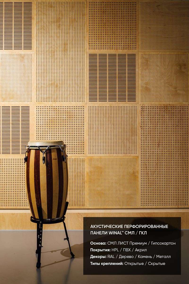 Примеры применения стеновых и потолочных акустических звукопоглощающих / звукоотражающих перфорированных панелей WINAL™ на основе окрашенного гипсокартона ГКЛ и СМЛ листа. Широкий выбор отделки панелей декоративными покрытиями