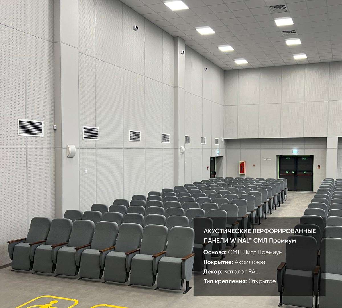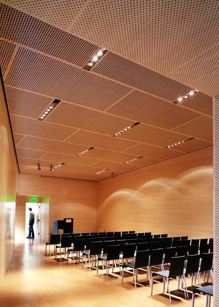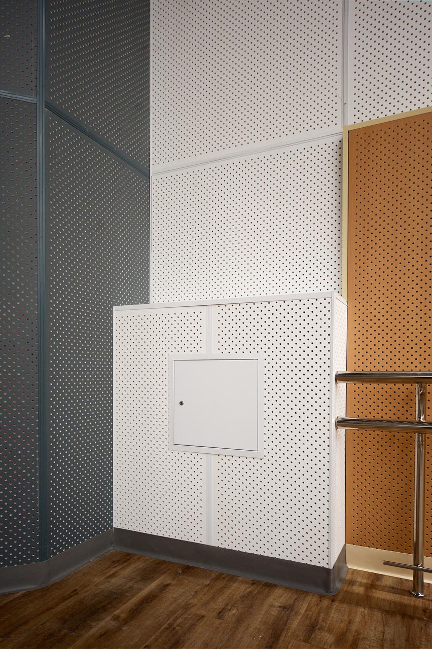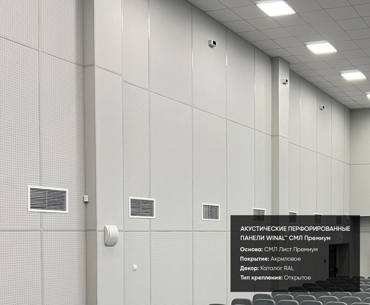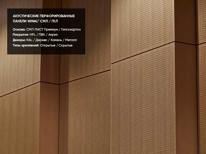 Примеры применения стеновых и потолочных акустических звукопоглощающих / звукоотражающих перфорированных панелей WINAL™ на основе окрашенного гипсокартона ГКЛ и СМЛ листа. Широкий выбор отделки панелей декоративными покрытиями