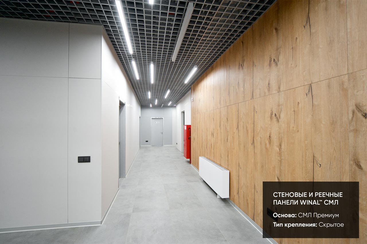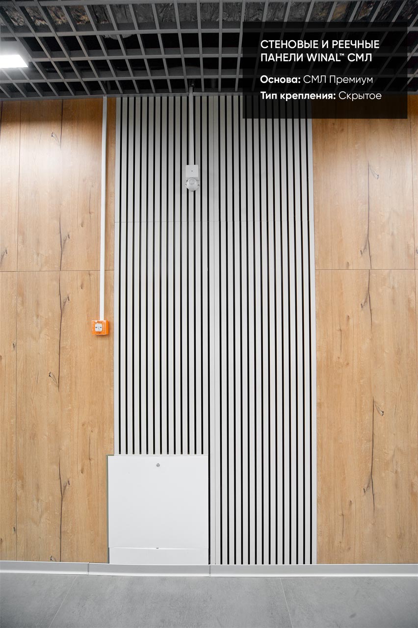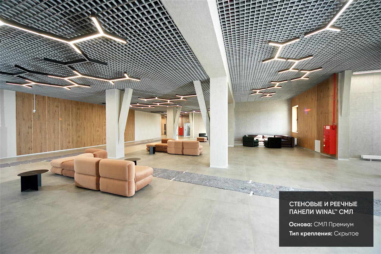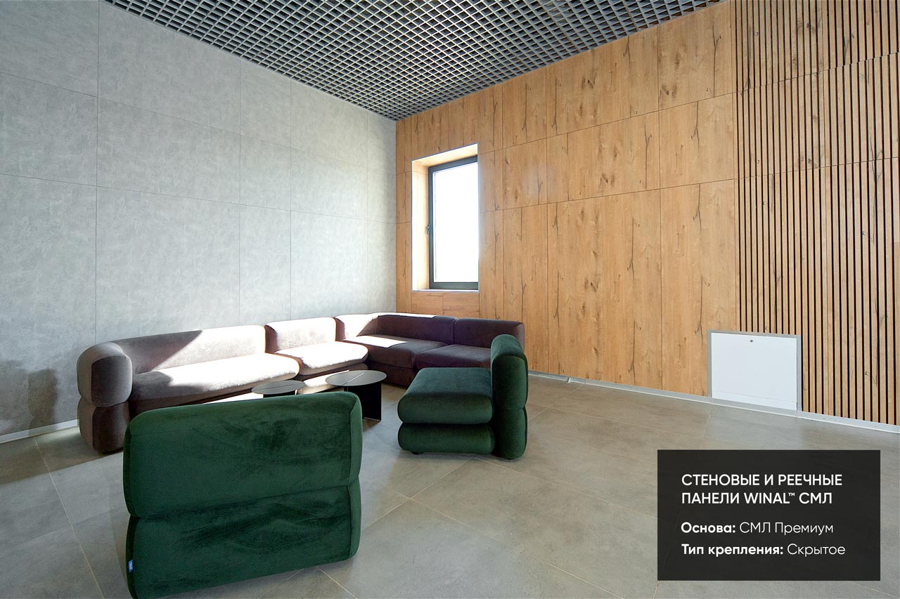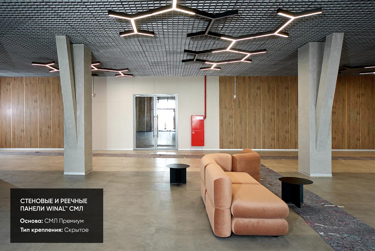 Декоративные панели для стен и рейки на основе СМЛ листа премиум в интерьерах офисного центра кинокластера Москино