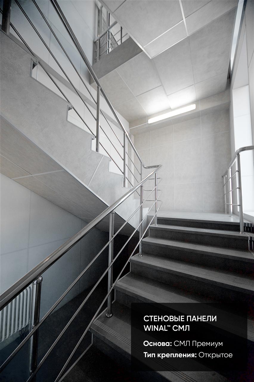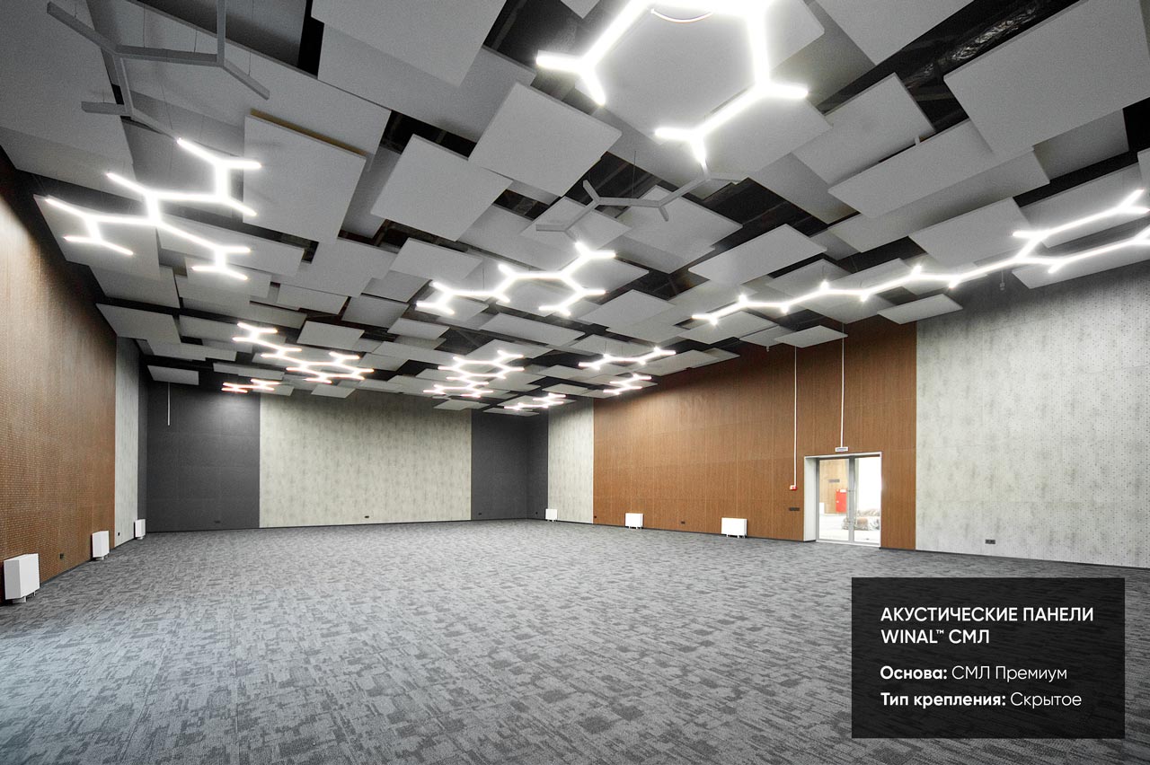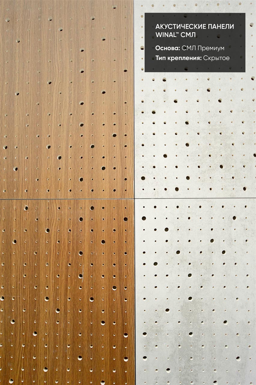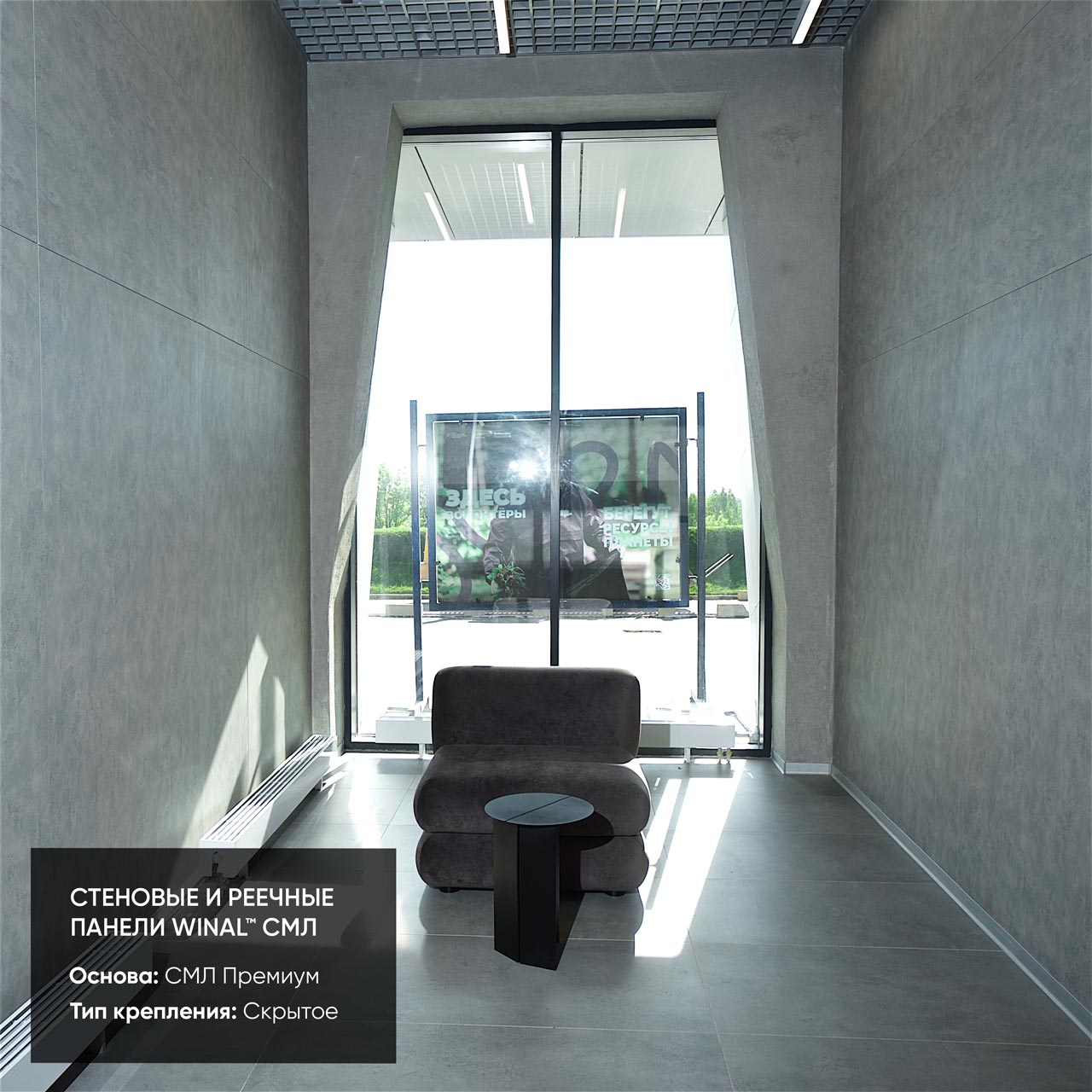 Декоративные панели для стен и рейки на основе СМЛ листа премиум в интерьерах офисного центра кинокластера Москино