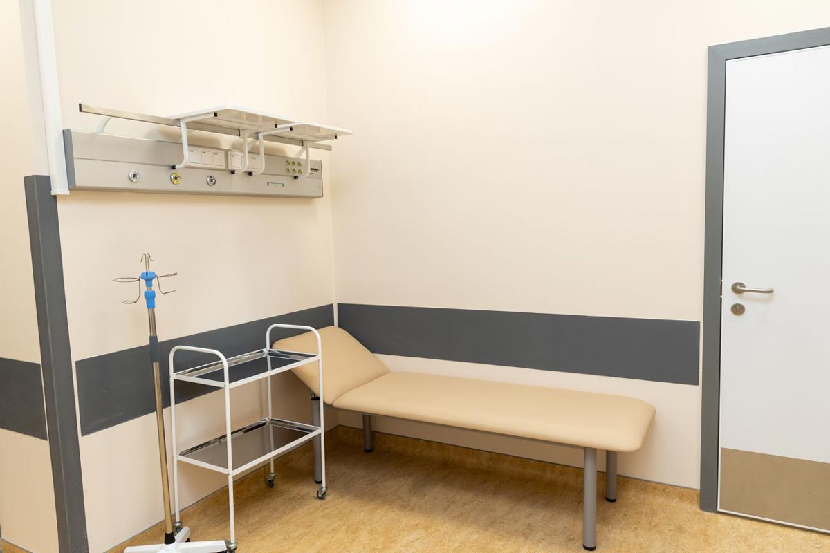 Комплексная отделка стен и потолков медицинскими панелями негорючими антибактериальными на основе СМЛ листа премиум, использована комбинация скрытой и открытой системы монтажа алюминиевым профилем, на панелях также установлена декоративная отбойная доска для защиты стен от повреждений.