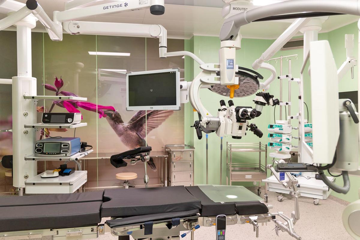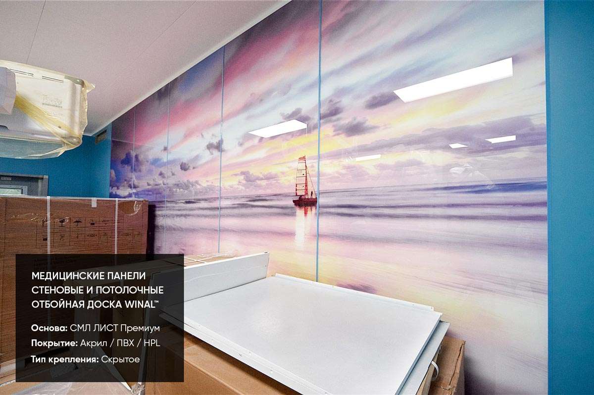 Помимо дизайна и эстетики важнейшим требованием к медицинским панелям было соответствие нормам пожарной безопасности, поэтому были выбраны панели на основе стекломагния, поскольку СМЛ лист премиум соответствует классу КМ-0 (Негорючие стеновые панели). В качестве декоративных покрытий панелей были выбраны пластиковые HPL покрытия и акриловые однотонные рал цвета. Потолочные панели также было необходимо выполнить на основе СМЛ листа. В кабинетах хирургии и МРТ была использована декоративная 3D печать изображений на панели с нанесением глянцевого УФ лака.