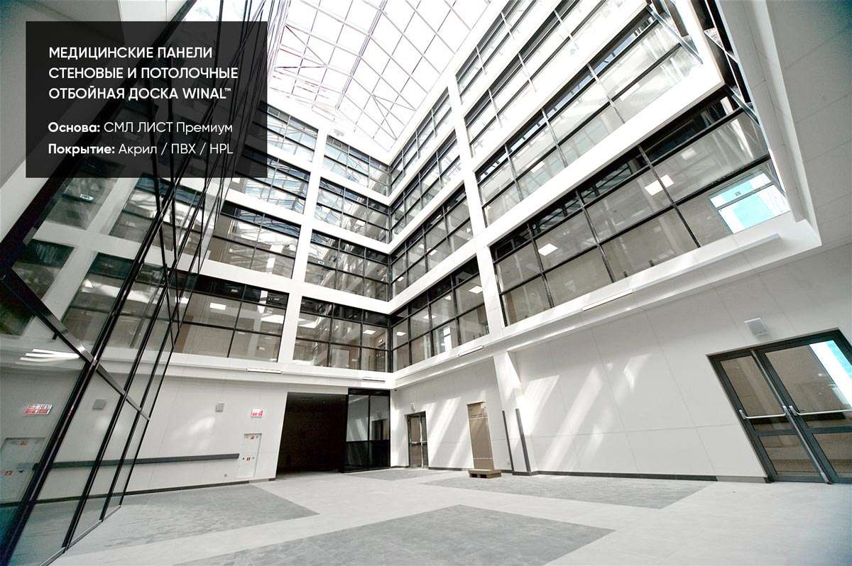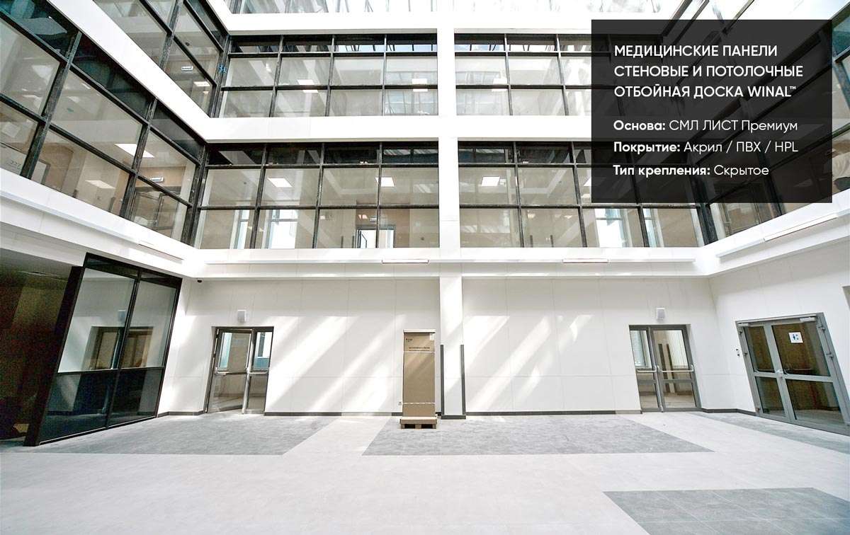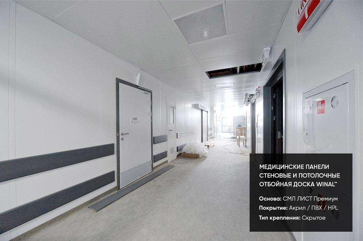 Комплексная отделка стен поликлиники медицинскими антибактериальными негорючими панелями СМЛ для стен и потолков, использована открытая система монтажа алюминиевым профилем омега, установка отбойной доски