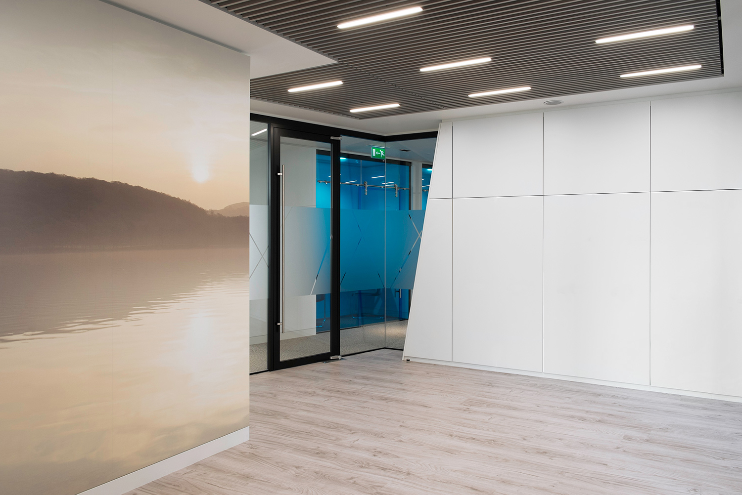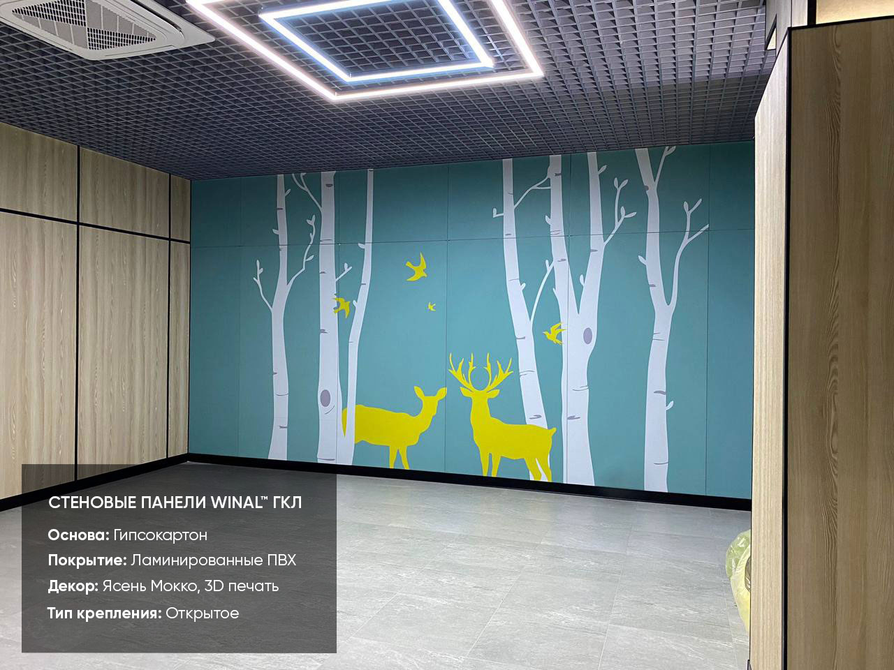 Нанесение фирменных изображений на декоративные стеновые панели СМЛ ГКЛ методом УФ печати это практичность, индивидуальность и фирменный стиль в офисе.